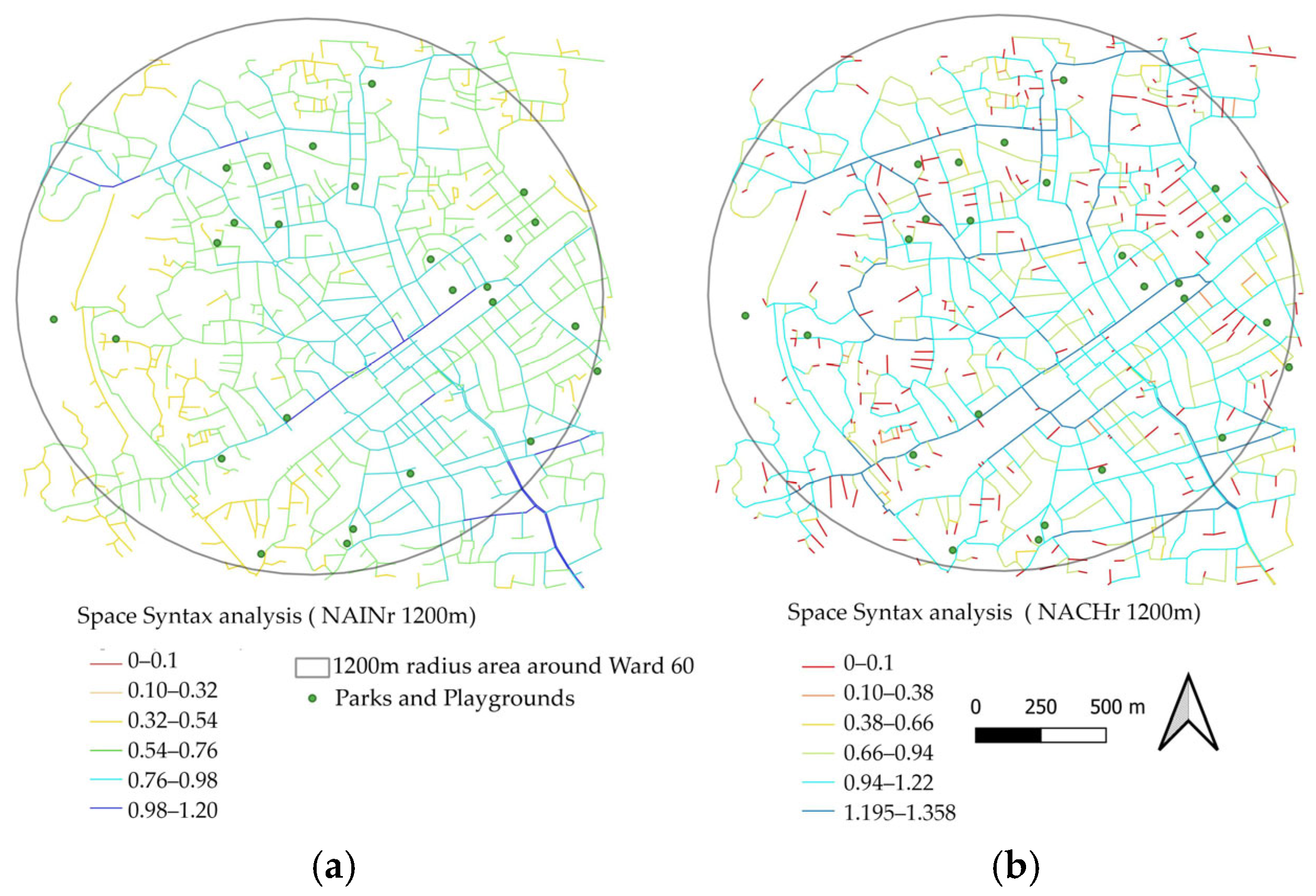 - Donegan, L.; Tavares, F. Tuning in: Investigating OSMnx RCL model preparation methods for Angular Segment Analysis. In Proceedings of the 13th Space Syntax Symposium, Bergen, Norway, 20–24 June 2022; pp. 1–17. [Google Scholar]