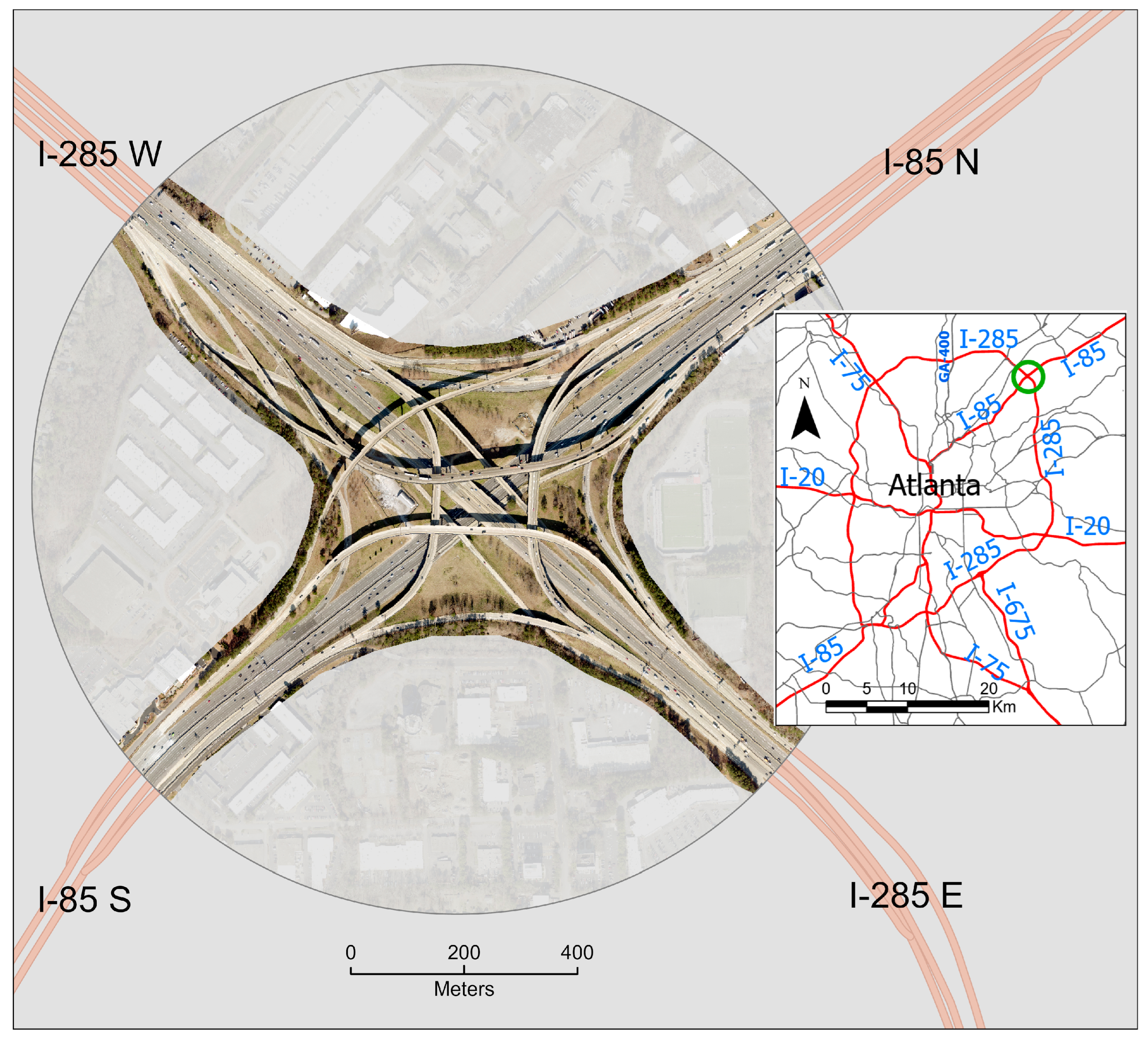 Urban transportation networks worldwide face significant strain from congestion, which affects safety, mobility, and sustainable development [1,2,3,4]. Major highway interchanges are particularly prone to delays because they serve as critical nodes linking regional and interstate traffic [5]. Among these, Atlanta’s “Spaghetti Junction,” formally the Tom Moreland Interchange of I-285 and I-85, has consistently ranked high among the most congested bottlenecks in the United States [6]. With commuters, freight vehicles, and through-traffic converging, congestion at the junction significantly affects both local and long-distance travel across the southeastern U.S.