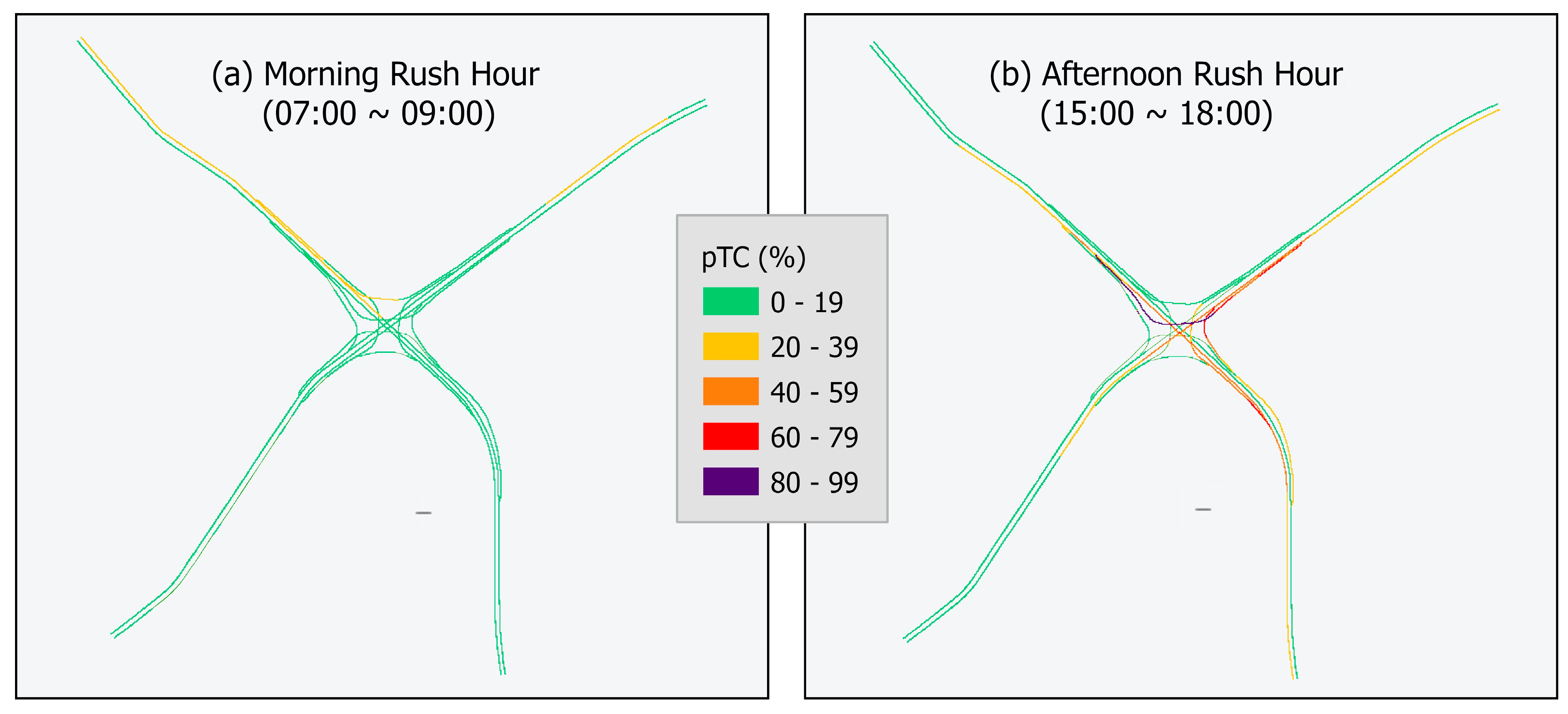 When rush-hour congestion patterns were mapped (Figure 4), the northbound routes from W, S, and E showed the heaviest congestion, particularly on the curved ramp from W with more than 80% pTC. The eastbound routes from W and N also experienced heavy congestion up to 80% pTC. In contrast, the westbound and southbound routes showed relatively lighter congestion of less than 40%, with the southbound route being the lightest. Overall, the spatial pattern indicates that the north bound from the junction forms a major bottleneck section, followed by the east bound.