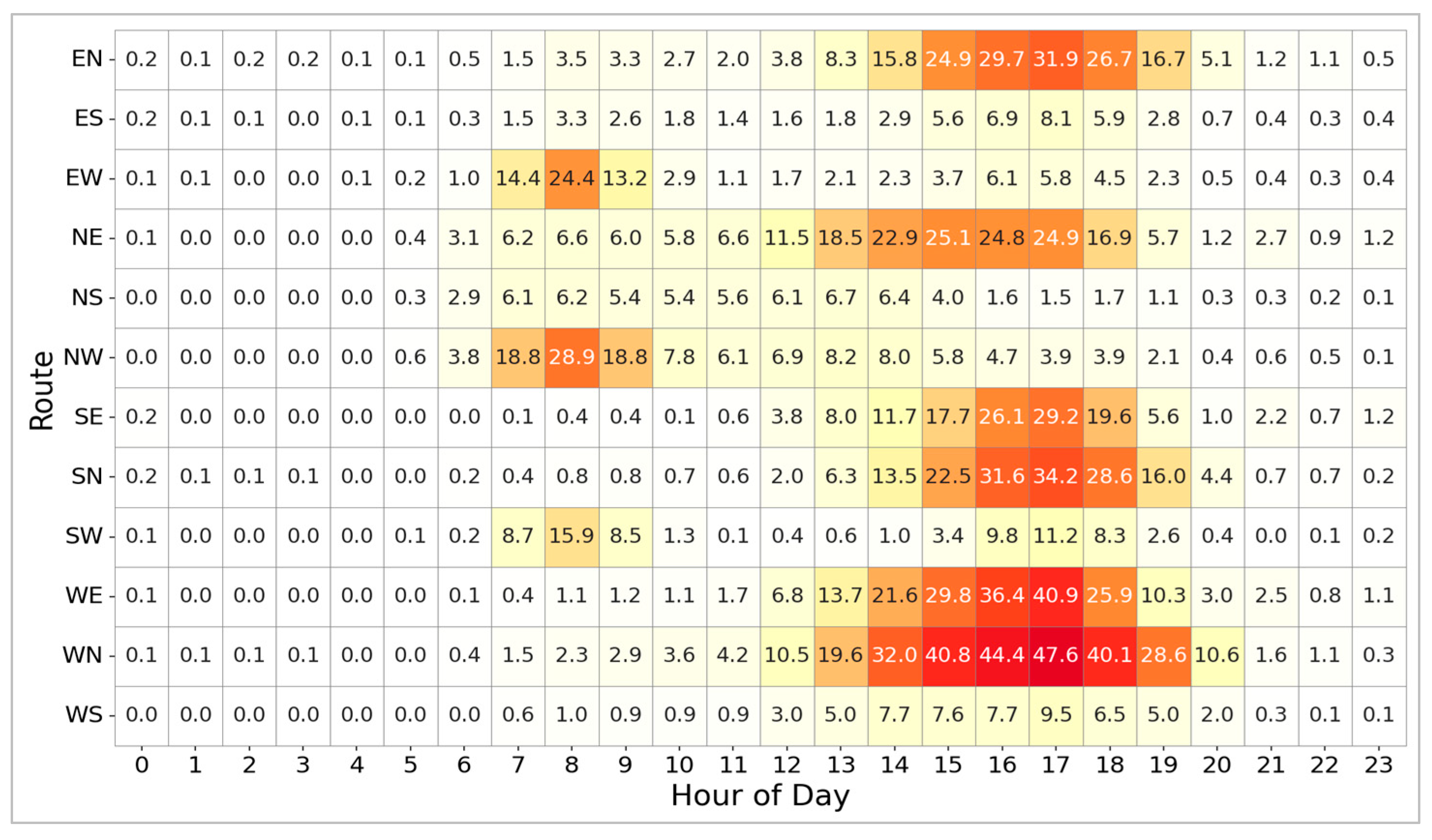 Figure 5. Average pTC by route and hour during weekdays. In this heatmap, lighter colors represent lower congestion levels, while darker orange to red tones indicate increasingly higher congestion.