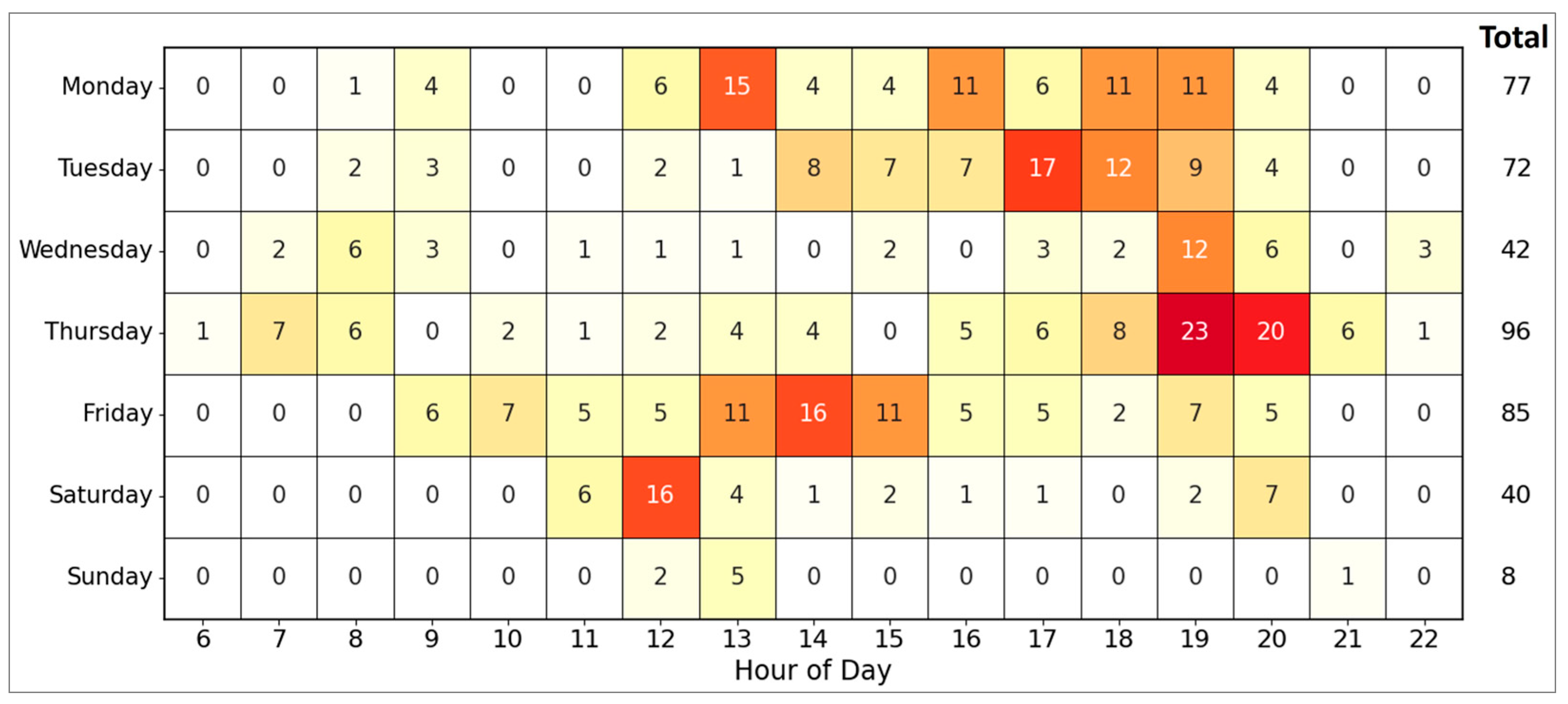 Anomalies were detected with residual values where z-score values are greater than 2.326, indicating that pTC is at least 14.2 higher than the residual mean. Figure 11 shows the frequency of anomalies by weekday and time of day. The temporal distribution of anomalies revealed that they were predominantly observed during weekday afternoons. From Monday to Thursday, most anomalies occurred between 16:00 and 20:00, while on Friday, they were concentrated between 13:00 and 15:00. On Monday, anomalies were observed not only during the evening hours but also early in the afternoon, with 21 cases recorded between 12:00 and 14:00. Thursday recorded the highest total number of anomalies, with 96 cases. Particularly, 43 anomalies occurred between 19:00 and 21:00 on Thursday. During the weekend, 16 anomalies were clustered between 12:00 and 13:00 on Saturday.