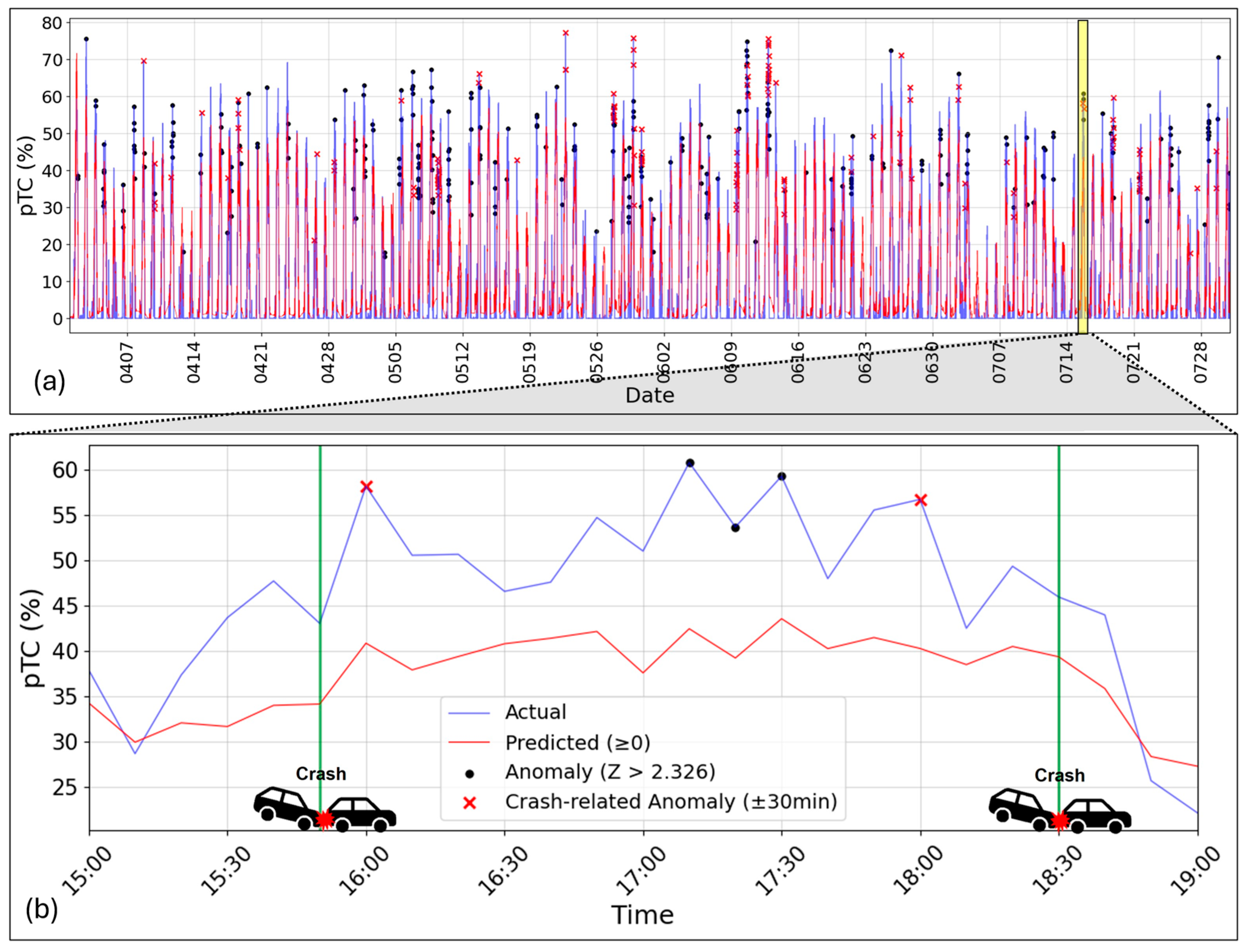 Figure 12 presents the overall and July 15th anomalies, further marked with crash-related anomalies. In Figure 12a, pTC values mostly remain below 40 on weekends, and anomalies occur infrequently. In contrast, during weekdays, pTC values typically exceed 40, and anomalies frequently appear around the time of daily peak congestion. While some of these anomalies are related to crashes, others are not crash-related. On July 15th (see Figure 12b), five anomalies were detected between 15:00 and 19:00. Among them two anomalies matched with the crashes occurred around 16:00 and 18:30.