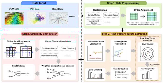 - Data Preprocessing. This stage processes multi-source input data, such as DEM or POI datasets. It employs rasterization to convert unstructured data into standard feature matrices and performs matrix order adjustment to ensure a unique center point, establishing a foundation for subsequent analysis.