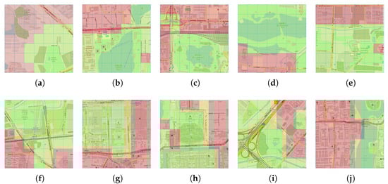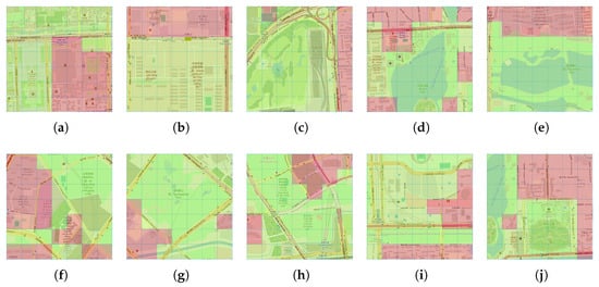 TOP-10 matching results of Taoranting area on POI dataset. Red and green overlays highlight the corresponding high-density and low-density areas in each matched region. The overlaid grid on each map represents cells. (a) P1. (b) P2. (c) P3. (d) P4. (e) P5. (f) P6. (g) P7. (h) P8. (i) P9. (j) P10.