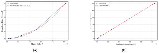 The relationship between the search space dimension (R) and the total execution time (T) is presented in Figure 9a. The plot clearly exhibits a quadratic growth trend. To further clarify this relationship, execution time was also plotted against the total number of pixels in the search space (), as shown in Figure 9b, which reveals a strong linear relationship.