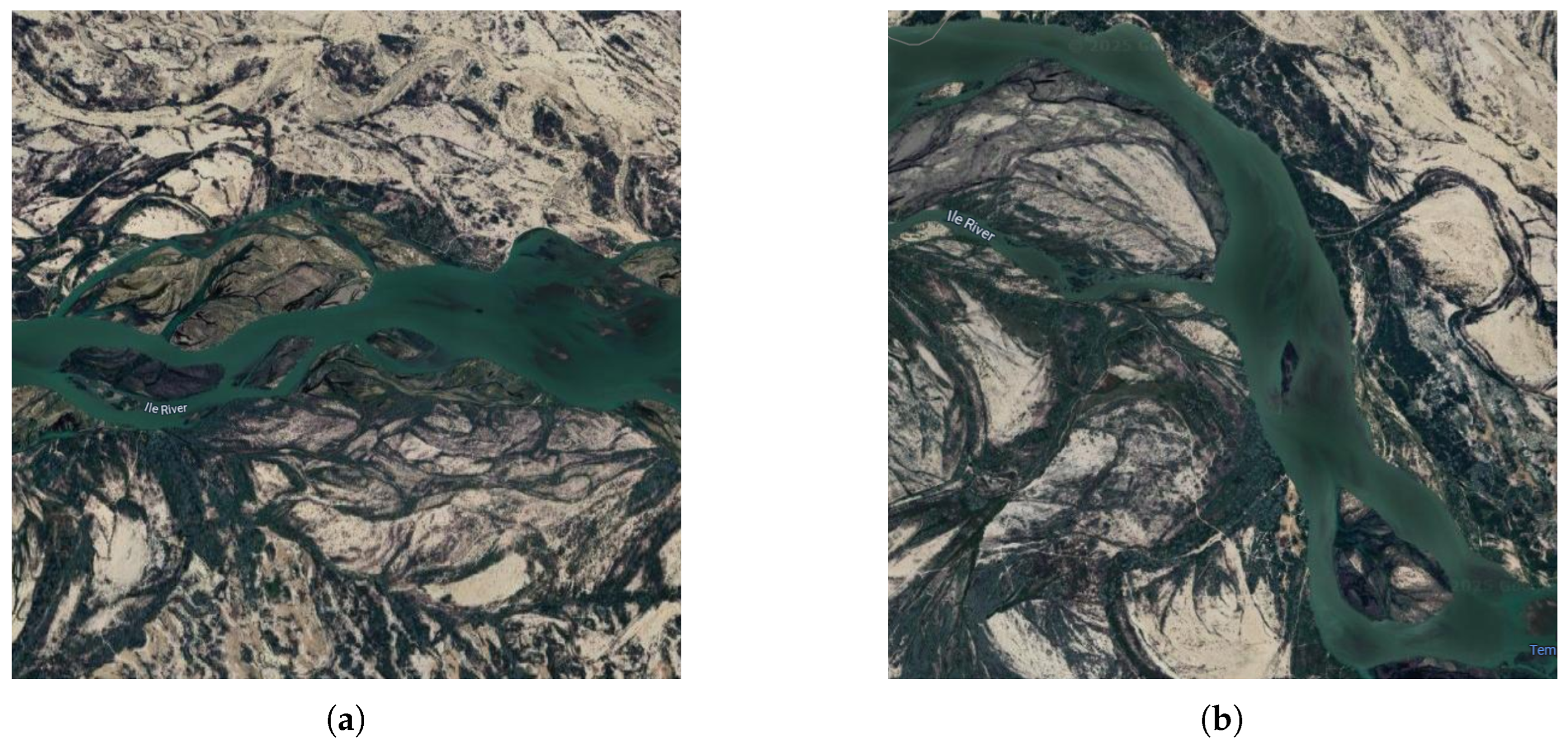 - Directional Sensitivity Issues. Traditional grid or pixel-based comparison methods, such as template matching algorithms, exhibit high sensitivity to rotation. The accuracy of these methods decreases significantly when similar regions undergo rotational changes [12,13]. When identical geographical features are present in different orientations (e.g., north-south versus east-west river valleys, as shown in Figure 1), conventional methods struggle to identify their intrinsic similarities. This issue is particularly pronounced in remote sensing data processing, as the orientation of topographical features is often determined by natural evolutionary processes. Functionally similar regions may exhibit significant directional differences, exemplified by the contrasting ridge orientations of the Himalayan and Alpine mountain ranges.