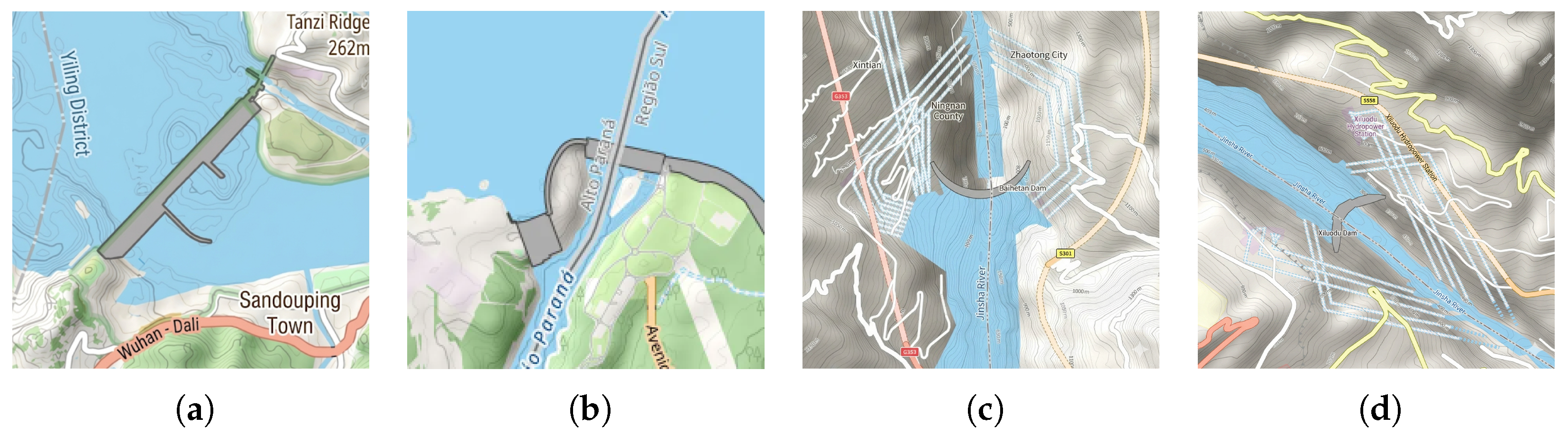- Arch Dams: These are primarily concentrated in deeply incised canyon regions with narrow V-shaped or U-shaped valleys. These sites feature steep slopes, high mountain symmetry, significant elevation differences, and dramatic terrain fluctuations. Representative projects include Baihetan Hydropower Station (Jinsha River, China), Xiluodu Hydropower Station (Jinsha River, China), Wudongde Hydropower Station (Jinsha River, China), Jinping-I Hydropower Station (Yalong River, China).