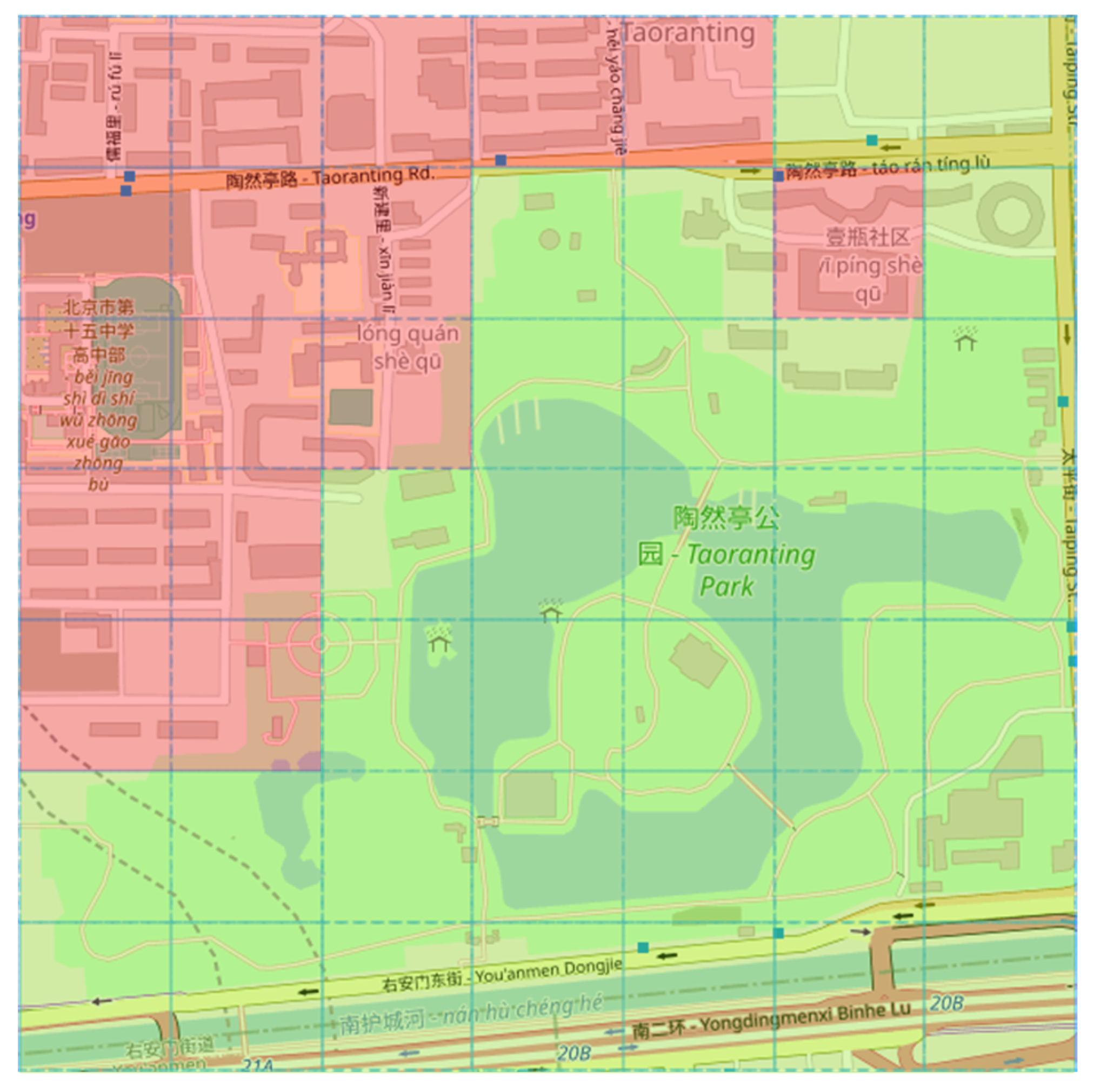 - Taiyangong Sports and Leisure Park and its southwestern region (P6): sparse POI in the large park area, dense POI in the southwest with residential areas, schools, and companies.