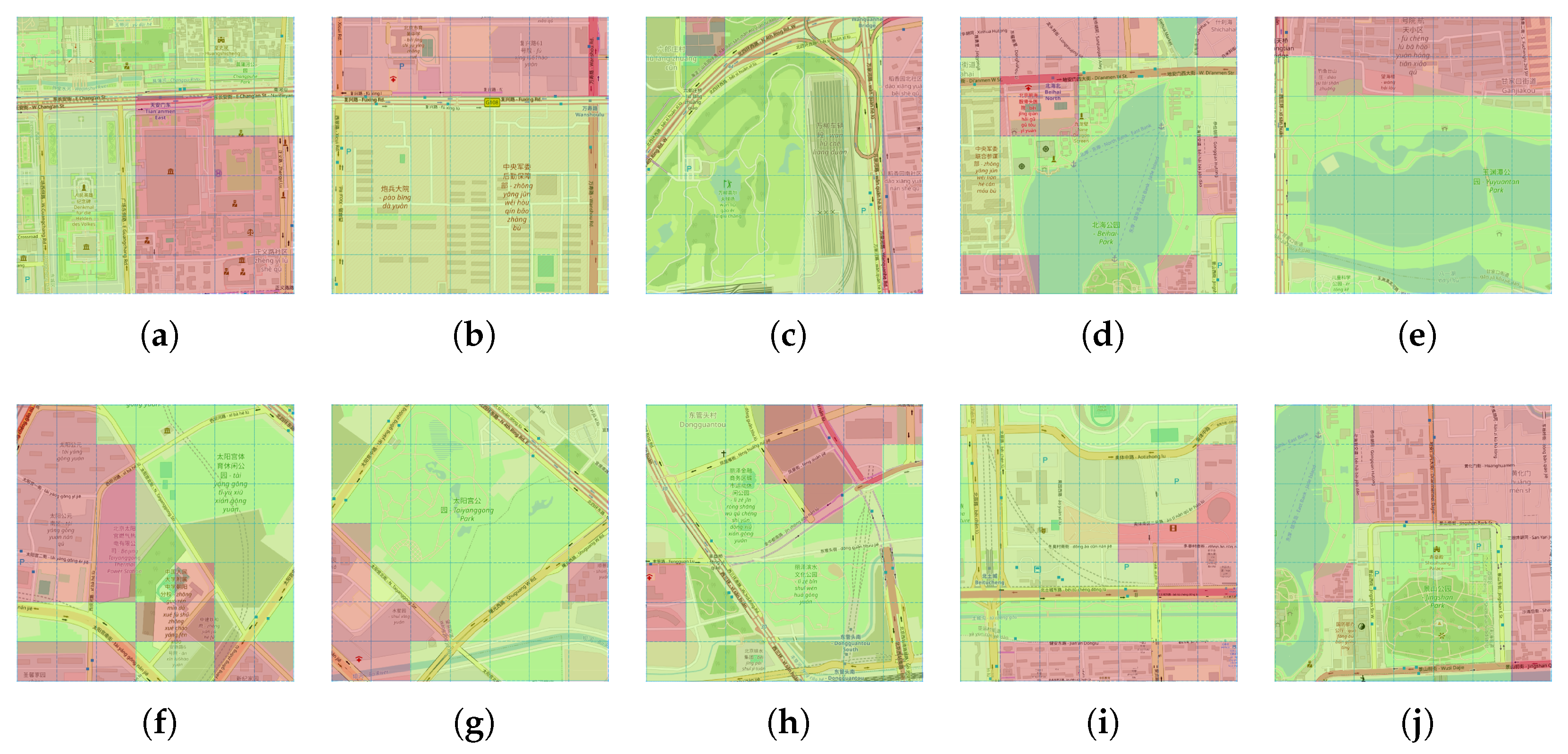 - Experiment 3: Urban Functional Area Identification. WiFi access point and POI distributions within Beijing’s Fourth Ring Road were analyzed to demonstrate adaptability to urban spatial data. The study area was partitioned into 200 m × 200 m grid cells, totaling cells.This cell size was chosen to align with typical urban functional block scales in Beijing, where coherent zones (residential compounds, commercial clusters, parks) span 100–300 m. Finer resolutions would fragment functional areas across excessive cells, while coarser resolutions would merge distinct zones. At 200 m resolution, the grid provides sufficient detail for block-level analysis while maintaining computational tractability for large point datasets. Taoranting Park and its northwestern region were selected as the template, exhibiting a distinct “dense on one side, sparse on the other” pattern characteristic of park-residential interfaces. The top 10 most similar regions () were retrieved for both datasets.
