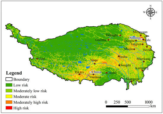 Disaster-prone environmental factors were spatially overlaid with disaster-inducing factors. The spatial weights of these environmental factors were determined based on their contribution derived from Geodetector analysis. The overlay results were subsequently classified using the natural breaks (Jenks) method, producing the spatial distribution of hypoxia hazard among short-term visitors on the Qinghai–Xizang Plateau (Figure 6). Overall, the majority of the plateau exhibits high to moderately high hypoxia hazard levels. Extensive contiguous high-risk zones, covering approximately 65.0% of the area, are predominantly concentrated in the western, northern, and central interior regions, including Naqu, Geermu, and the Gaer area. This pattern closely correlates with widespread elevations above 4500 m and markedly reduced atmospheric pressure, leading to insufficient atmospheric oxygen and elevated hypoxia hazard. Moderate and moderately low-risk zones are mainly located along the eastern edge of the Qinghai–Xizang Plateau and in specific river valleys, including the Yellow river–Huangshui river Valley, Qaidam Basin, the central plateau, and western Sichuan Plateau, covering approximately 32.1% of the area. These regions experience milder hypoxia due to comparatively lower elevations and the mitigating influence of local topography and vegetation. In contrast, low-risk zones occupy a relatively small area, accounting for approximately 2.9%. These zones are mainly confined to low-altitude river valleys and mountainous areas along the southeastern edge, including Nyingchi, Medog, and Shangri-La, displaying a scattered, patchy distribution. This highlights the role of topographical variation in shaping the spatial differentiation of hypoxia hazard.