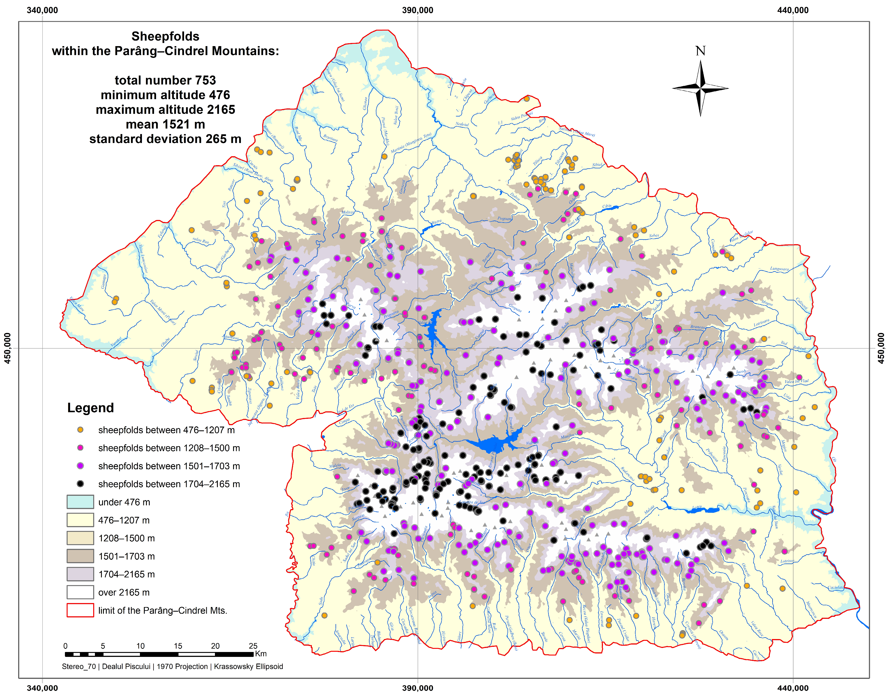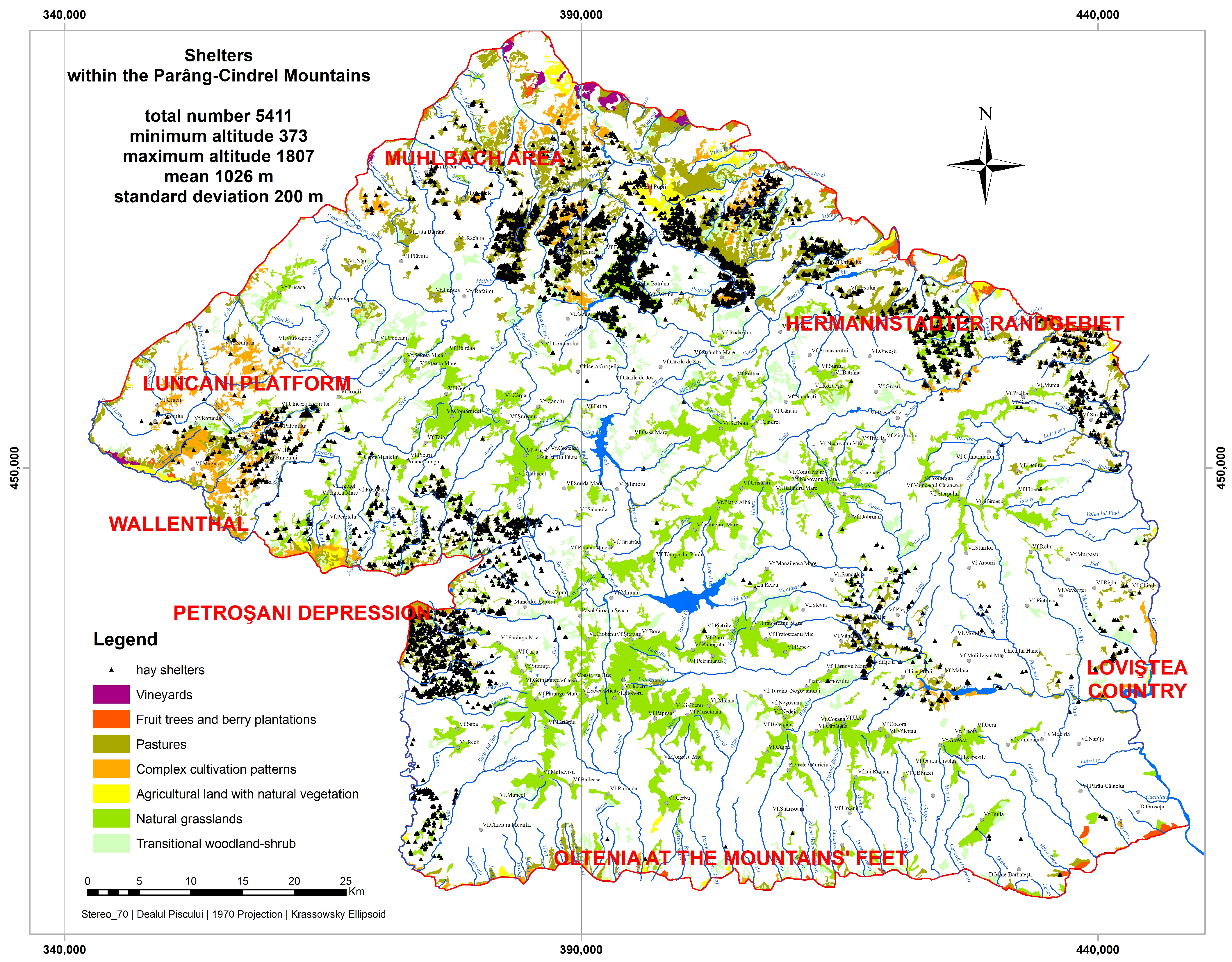 The paper maps the temporary dwellings in the five historical pastoral areas within the central part of the Southern Carpathians, namely Marginimea Sibiului (north-est), Luncani Platform (north-west), Petrosani (south-west), Oltenia at the Mountains’ Feet (south), and Lovistea Country (east). The highest density of shelters is found within Sureanu-Cindrel Mountains, where the longstanding historical traditional pastoral zones such as Marginimea Sibiului, Sebes, and Luncani are found. The north–south and west–east strips of sheepfold correspond to formal transhumance routes and traditional grazing plateaus, thus confirming the third research question that the current spatial distribution is consistent with the traditional pastoral areas. Still, there are some changes that we acknowledge.