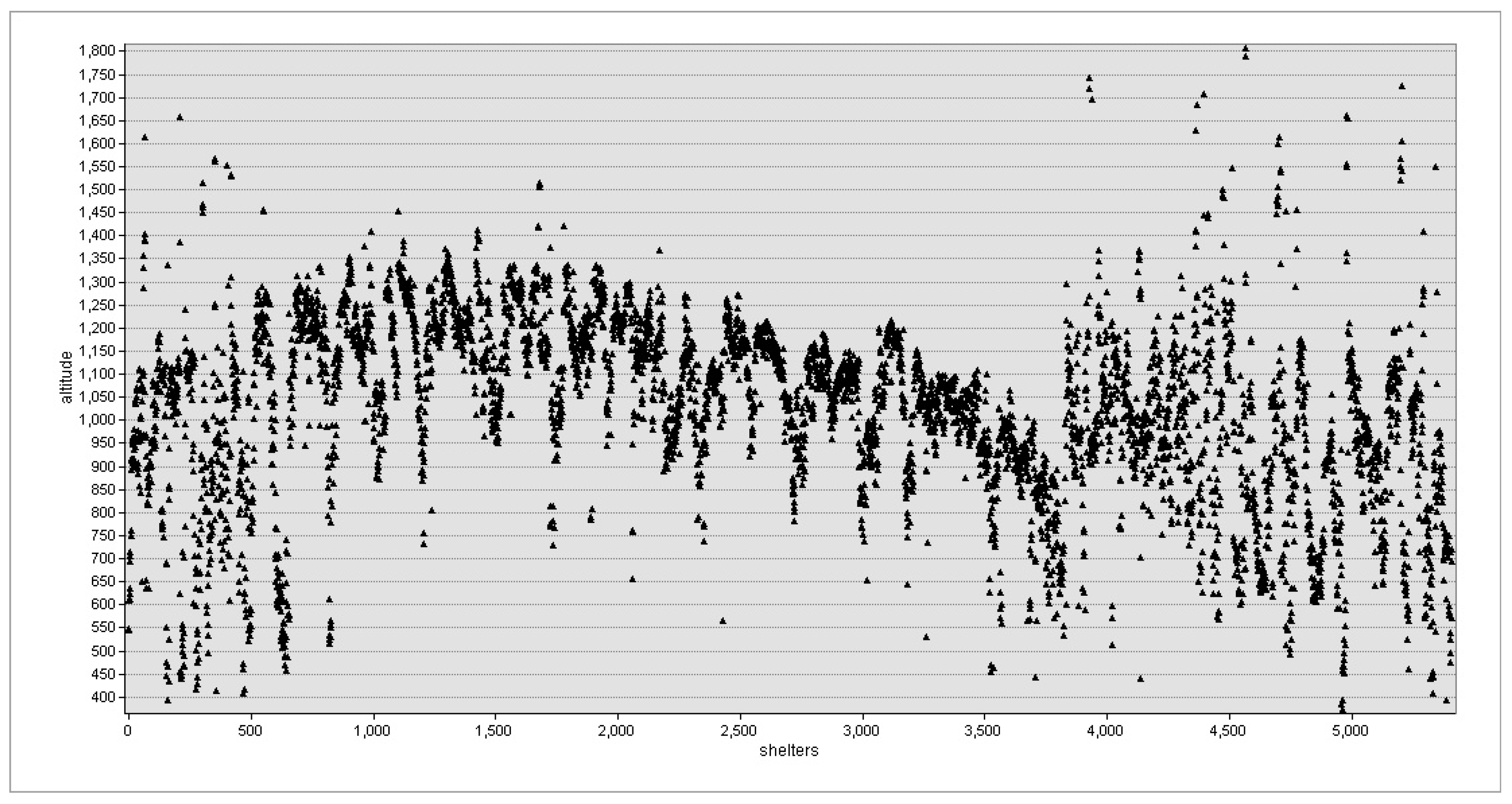 The main driving factors shaping the distribution patterns of shelters are, first, the differing pastoral traditions and the varying extent of transhumance in the six distinctive regions. A second explanation for the distribution pattern is the unequal size of sheep and cattle herds owned by local communities, with the northern and especially the north-western (Transylvanian) areas holding the largest livestock numbers. More than 80% of the analyzed shelters are located at elevations between 900 and 1200 m.