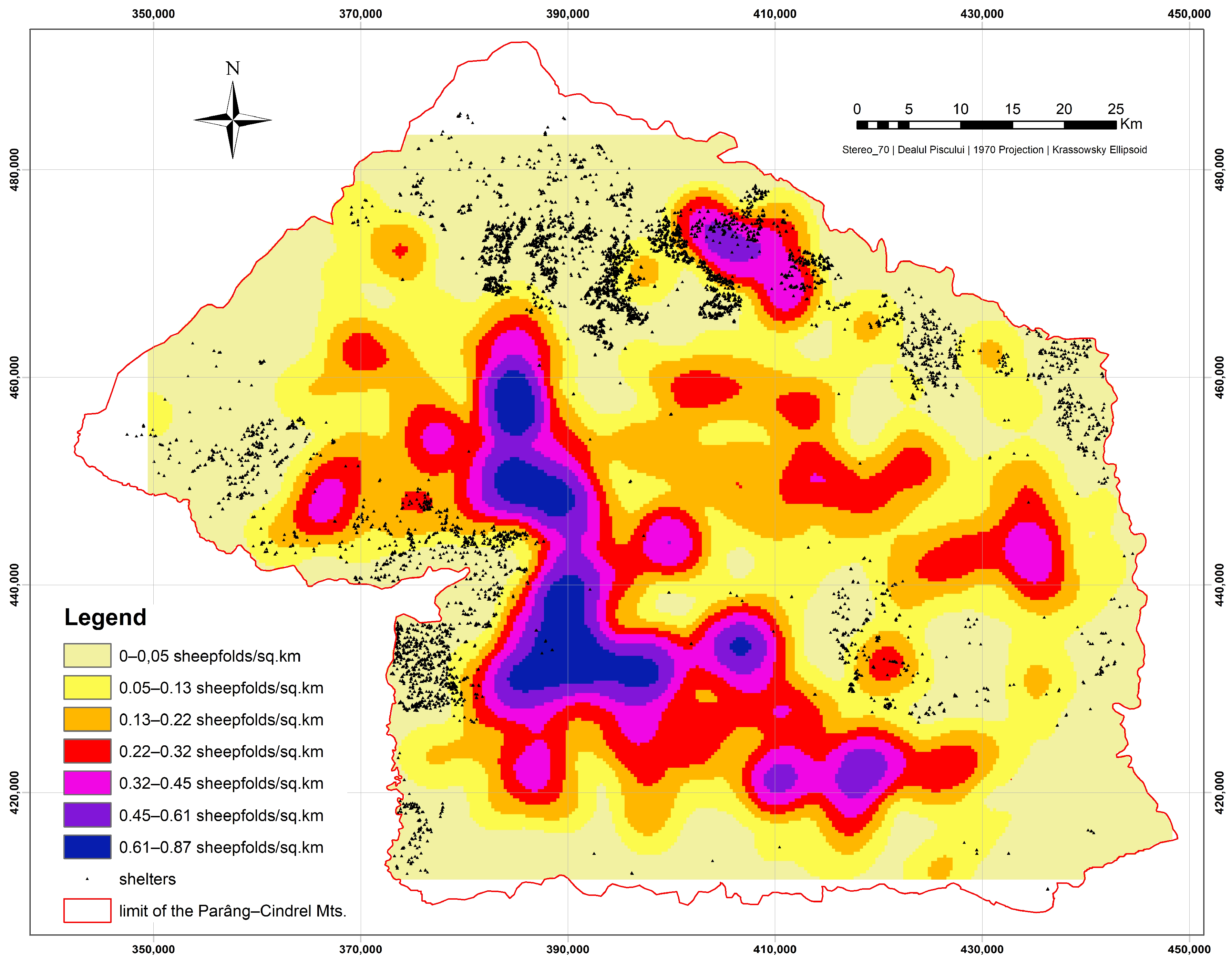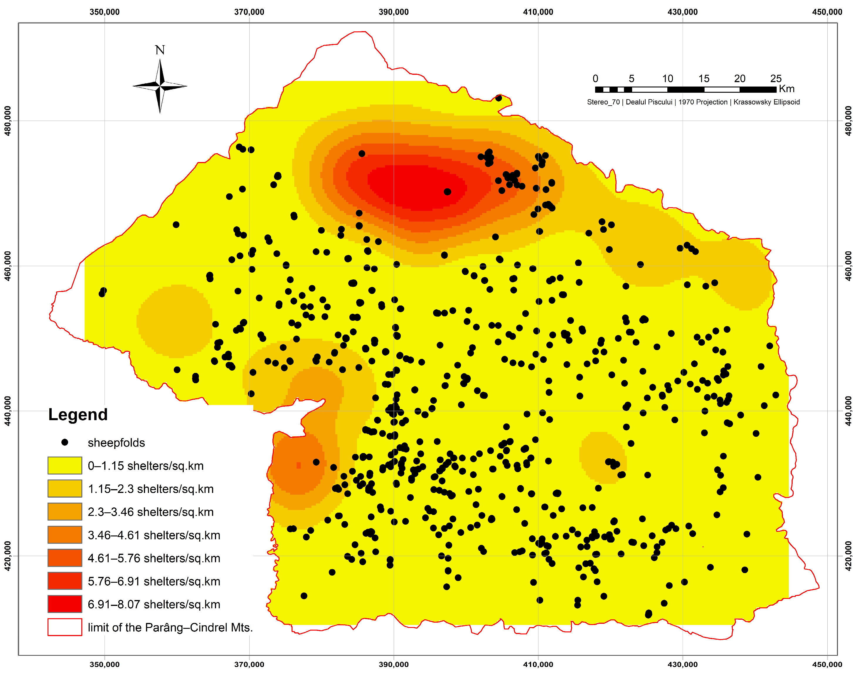 The results highlight two clear clusters of shelters: (1) the largest cluster, with the highest density (over 8 shelters/km2), is located in the northern sector, within the Șureanu–Cindrel Mountains (Mărginimea Sibiului-Sebeș Valley), which also contain the most extensive hayfield areas; (2) a second high-density cluster is found in the south-western area (near the Jiu Valley), although it is smaller. Sheepfolds are less clustered than shelters.