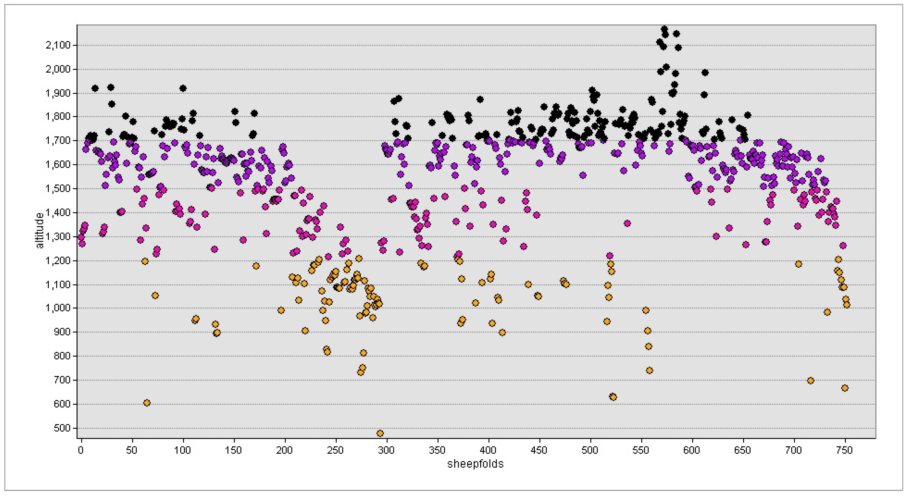 The spatial distribution of sheepfolds reveals continuous north–south and west–east high-density bands in the central-western part of the study area and another significant local cluster in the north-east. The study further identifies the spatial patterns of sheepfolds (altitudinal distribution and density), grouped into three elevation categories.