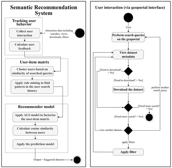 As shown in Figure 1, the proposed semantic recommendation system framework for geoportals comprises three main steps: Tracking User Behavior, User–Item Matrix, and Recommender Model, which will be explained in detail in the following sections. Before explaining these steps, it is necessary to specify a preliminary stage, shown in the UML activity diagram as the “User Interaction (via Geoportal Interface)”. The User Interaction box represents user-driven activities, including search terms, viewing dataset details, downloading datasets, and applying filters. These activities serve as the starting point for system processes but are not directly connected to the approach. Instead, a starting point leads to the “Collecting User Interactions” process, where these actions are logged and analyzed to improve the recommendation system. The following subsections present each step of the framework.