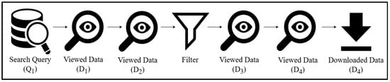 Figure 2 adapted from Li et al. [46], illustrates a typical user search process. Users begin by entering keywords (as search terms) and selecting several datasets from the search results. They may then apply a filter (e.g., spatial coverage) and proceed to view additional datasets before eventually downloading some. It is also possible for users to click on other datasets after downloading. As stated in many studies [21,46], strong relationships exist between the search query, applied filters, viewed datasets, and downloaded datasets, making these interactions valuable for analysis. However, certain dependencies, such as the sequence of clicks, can introduce noise. For instance, clicking on Dataset 2 (D2) after D1 does not necessarily indicate that D2 is more relevant than D1.