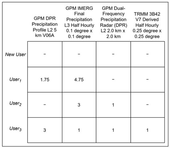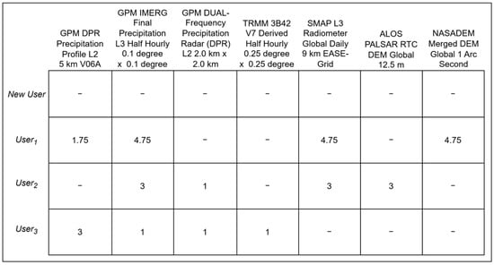 In the proposed semantic recommender system, traditional recommender systems are improved by having rule mining processes to facilitate search query completion and address the limited diversity of results in the geospatial dataset domain. The system applies association rule mining within user clusters that are formed based on the semantic similarity of their search queries, uncovering correlations between different user queries to inform the recommendation of new search terms. For instance, if a New User interested in flood modeling searches for “Precipitation” and “Soil Moisture” datasets, they will likely also require datasets related to the “Digital Terrain Model (DTM)”, because understanding the topography is crucial for predicting how precipitation will flow and accumulate in areas with varying soil moisture levels during flooding. Association rule mining identifies these patterns by analyzing past user behavior, learning from frequent co-occurrences of search terms and then appending the related datasets to the user–item matrix. Returning to the previous example of the creation of the user–item matrix, by considering the associations between the search terms “Precipitation” “Soil Moisture” and “DTM”, the updated user–item matrix also includes the users’ interests in the datasets regarding DTM, even if the new user only searched for “Precipitation” and “Soil Moisture”. Figure 5 illustrates the final user–item matrix by considering both semantic clustering and rule mining of the provided example for New User.