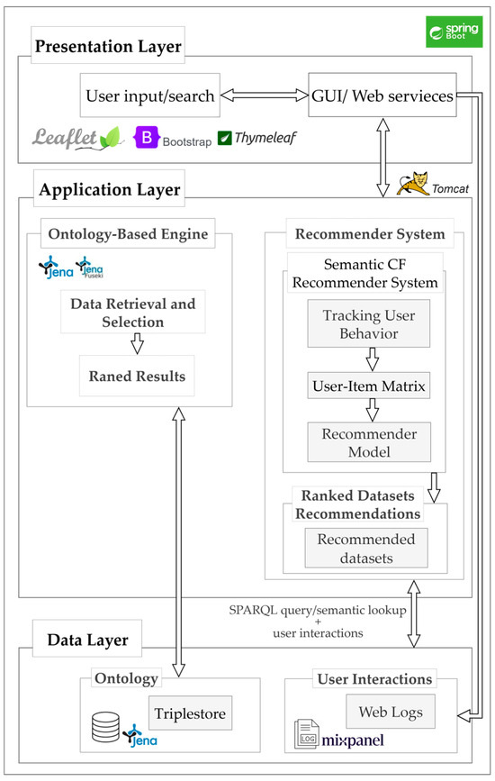 The overall system architecture is shown in Figure 6. It comprises three layers: a presentation layer responsible for user interaction through the geoportal interface, an application layer that hosts both the ontology-based engine and the proposed recommender system, and a data layer that manages the ontology and user activity logs.