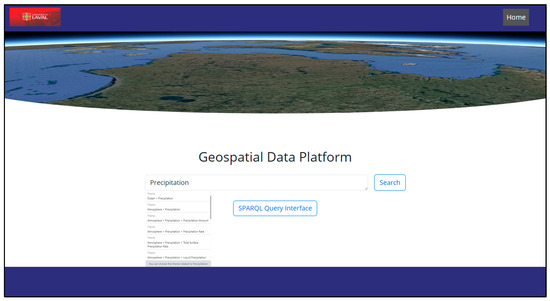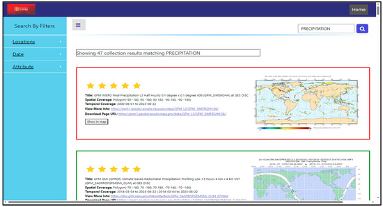 Figure 8 presents the search results for the query “Precipitation,” where the system retrieved all datasets associated with this theme based on their semantic metadata. The results page lists relevant datasets along with key descriptive attributes such as title, spatial and temporal coverage, and source information.