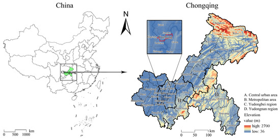 Chongqing, located in the mountainous region of southwest China (Figure 2), is characterized by its “big city, big countryside, extensive mountainous, and reservoir areas” and was designated in 2007 as a pilot area for national urban–rural comprehensive reform. As the economic center of central and western China, Chongqing has a solid foundation for RIE development. Counties serve as the primary spatial unit for implementing RIE-related policies in China, including urban–rural integration and rural revitalization; thus, this study focuses on counties as the research unit. Because Yuzhong has been fully urbanized, the study focuses on the remaining 37 counties in Chongqing. This study examines 2013, 2018, and 2023 as part of its time series analysis. These years reflect fundamental policy shifts, including China’s 2012 transition towards high-quality employment development and the 2017 introduction of the rural revitalization strategy.