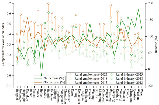 The results of the comprehensive evaluation index of the RIE system in Chongqing are shown in Figure 3. Overall, the RIE of most districts and counties has substantially improved over 2013–2023, with an average increase of 91.17% in the comprehensive evaluation index of rural industry and 88.45% for rural employment. Comparing the two periods, the rate of growth in the RIE system from 2013 to 2018 is more significant than that from 2018 to 2023. Some decline is also observed in the RIE system, notably in the rural industry systems of Nanan and Beibei from 2013 to 2018 and in Beibei and Qianjiang from 2018 to 2023; notably, all of these are municipal districts of Chongqing. In spatial terms, a marked spatial “ripple” effect emerges in the RIE system, characterized by two notable “peak” areas, one closer to the urban center and another in sub-marginal zones, where the comprehensive evaluation indexes of rural industry and rural employment are significantly higher than those of other regions. Regarding growth rates, the spatial trends of rural industry and rural employment are inversely related, with rural employment in peri-urban areas growing faster than in peripheral areas, while rural industry experiences relatively higher growth in Chongqing’s peripheral areas.