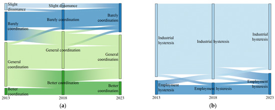 In terms of the level of coordinated development (Figure 4a), the coupling degree of RIE in Chongqing counties ranges from 0.443 to 0.788 over the period 2013–2023, exhibiting an initial upward trend followed by a subsequent decline, with no indication of significant dysfunction within the RIE system. Notably, only two units are classified as slight dissonance, and this classification disappears by 2023. The number of barely coordinated counties was 12 in 2013, decreasing to 8 in 2018 and then increasing to 11 in 2023. The general coordination counties represent the largest group, with 20 in 2013, decreasing to 17 in 2018 and then increasing to 20 in 2023. Meanwhile, the number of counties with better coordination increased rapidly from 3 in 2013 to 18 in 2018, before decreasing to 6 in 2023. Between 2013 and 2023, 17 counties experienced a change in coordination type, with 9 experiencing an increase and 6 showing an initial increase followed by a decrease. Nanan and Jiangbei exhibited only decreases, declining from general to barely coordinated levels. Regarding lagging factors (Figure 4b), the relative lagging of rural industry remains the primary constraint on the coordinated development of RIE. However, this situation shows slight improvement by 2023, with the number of lagging counties decreasing from 31 to 28.