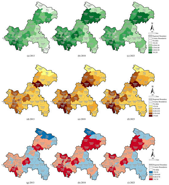 Spatio-temporal characteristics of RIE based on relative proximity. (a–c) Relative proximity of rural industry; (b–f) relative proximity of rural employment; (g–i) the coupling degree of RIE.
