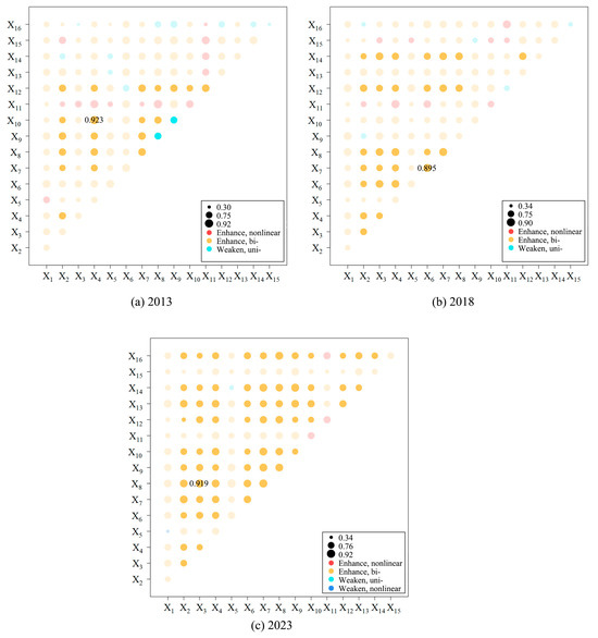 The results of interaction probes (Figure 6) reveal that the factors driving the coordinated development of the RIE system in Chongqing predominantly follow a bi-factor enhancement model. Among the interactions that passed the significance test, the top five factor pairs ranked by explanatory power in 2013 were X4∩X10 (q = 0.923), X2∩X9 (q = 0.856), X7∩X9 (q = 0.854), X7∩X8 (q = 0.851), and X7∩X12 (q = 0.847). In 2018, the top interactions were X6∩X7 (q = 0.895), X7∩X8 (q = 0.893), X4∩X8 (q = 0.884), X4∩X6 (q = 0.874), and X3∩X6(q = 0.872). In 2023, the leading interactions included X3∩X8 (q = 0.919), X7∩X8 (q = 0.911), X7∩X9 (q = 0.901), X9∩X14 (q = 0.899), and X8∩X16 (q = 0.890). All of these factor interactions exhibit two-factor enhancement, with explanatory power exceeding that of individual factors. This suggests that the coordinated development of the RIE system in Chongqing results from the combined influence of multiple systemic factors. Among these interacting factors, those appearing most frequently are the number of permanent rural residents (X7) and total investment in fixed assets (X8). These results indicate that the RIE system in Chongqing remains in an investment-driven development phase, with rural residents at the center of both industrial activity and employment opportunities.