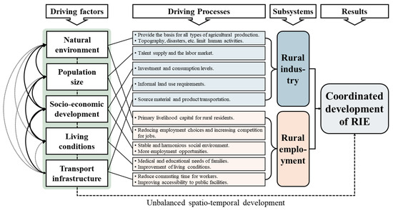 Coordinated development within the RIE system is essential to realizing rural industry’s employment potential and achieving rural revitalization fully. Stakeholders in the RIE system—industry operators, employees, and the government—have distinct and sometimes conflicting interests. Industrial operators prioritize production efficiency and profitability, viewing employment promotion as a secondary outcome. Employees seek stable, well-paying jobs to maintain their quality of life. The government aims to balance rural industrial development that drives economic growth with employment initiatives that ensure an adequate labor force for industry. Achieving this balance hinges on the coordinated development of the RIE system (Figure 1). Rural industry generates diverse employment opportunities, reshaping livelihood options for residents [38,59,60]. When residents start their businesses, they strengthen rural industries, creating additional employment cycles [28]. Coordinated development of RIE also produces significant spatial effects. Transaction costs lead industries to cluster naturally [61]. However, considerations like distribution costs, the market environment, and organizational efficiency drive the need for industry decentralization [62]. Separation of labor processes promotes both spatial concentration and decentralization of industrial factors. As space becomes a means of production, disparities in spatial costs lead to its continuous reconfiguration alongside labor division [63]. Specialized clustering of industrial factors creates spatial inequality in job types and conditions, directly impacting rural employment stability. Each RIE subsystem has internal drivers, but coordinated development relies more on shared external factors. Chinese scholar Wu [64] categorized the rural habitat system into five subsystems: natural, human, social, residential, and support. This framework aids in identifying the external factors impacting the coordinated development of RIE, as RIE itself is a component of the habitat system.