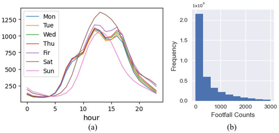 Hourly footfall distribution. (a) By day of the week. (b) Footfall counts—.
