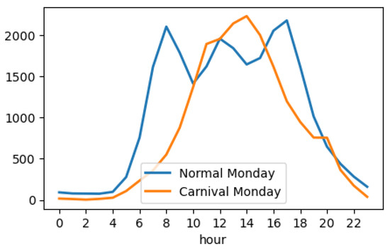 No sensor is installed around Notting Hill tube station. Still, there are two locations around High Street Kensington station, location 709 and location 957, which are popular locations for getting into the event. Figure 6 shows the change between an average Monday and Carnival Monday of location 709 in 2018. In the former, the typical morning/afternoon peaks at rush hour, plus a peek at lunchtime, are clear, while on Carnival day, there is only one peak at 2 p.m. and from 10 a.m. to 5 p.m., the volume of FF is in orders of more than 1500 people per hour. The data captured by these sensors successfully detect the change in FF around this area due to the unusual amount of activity and pedestrian flows.