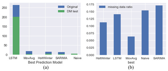 Footfall prediction results. The LSTM model emerge as the optimal for most of the locations with a high number scoring high in the DM test. In terms of missed data, we can observe how the MovAvg method performs poorly when many hourly FF counts are missed. (a) Optimal method counts. (b) Statistics of average missing data ratio.