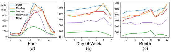 In many fields of study, data are continuously collected over time. Technological advances in database systems, neural networks, and cloud computing have promoted the conversion of temporal data to useful information to support the decision-making process. Traditionally, forecasting models focused on AR and MA have been considered among the most accurate forecasting approaches in over a half-century [12]. More recently, and acknowledging the shortcomings of such parametric models, several studies have introduced the non-parametric approaches based on ML algorithms on the forecasting of temporal datasets [13,14] since they do not presuppose the nature of time series distribution. Empirical research has shown that ML models perform quite well on temporal data forecasting and usually outperform the statistical approaches [15,16,17,18]. Parmezan et al. applied various indicators, including MSE, Theil’s U coefficient, POCID, and a multi-criteria performance measure, to evaluate the prediction performance of statistical and ML models. They demonstrated that the SARIMA model is the only statistical time series prediction model that performs better than some ML models on several datasets [19]. Another comparative study by Gautam and Singh [20] indicates that parametric models are competitive with ML models and perform better for some datasets evaluated by symmetric mean absolute percentage error (sMAPE). Finally, Han et al. [21] conducted a comparative study on the prediction performance of various models on both generated and real-world data, adopting traditional ML models as benchmarks and MAE together with MAPE as accuracy indicators.