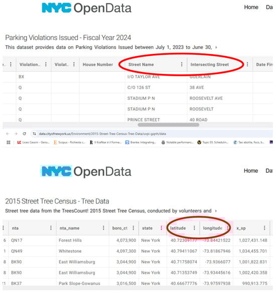 Consider the case of two OGD datasets both published by the New York City data portal: the “NYC Parking Violations Issued—Fiscal Year 2024” (https://data.cityofnewyork.us/City-Government/Parking-Violations-Issued-Fiscal-Year-2024/pvqr-7yc4/data (accessed on 16 January 2025)); and the “NYC 2015 Street Tree Census—Tree Data” (https://data.cityofnewyork.us/Environment/2015-Street-Tree-Census-Tree-Data/uvpi-gqnh/data (accessed on 16 January 2025)). Both datasets offer valuable information, but they differ significantly in how they represent location data, which poses a barrier to seamless integration (see Figure 1). The former dataset includes records of parking violations, detailing the violation code, issue date, and location. The location data in this dataset are represented using textual addresses. On the other hand, the latter dataset provides information about street trees, including their species, condition, and precise location using latitude and longitude coordinates.