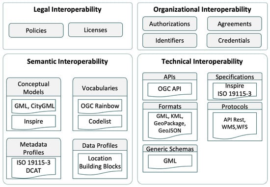 Figure 2 illustrates some OGC supporting actions that address interoperability issues within the geospatial domain, operating at different layers. These are crucial to ensure that geospatial data can be integrated, exchanged, and used effectively across various platforms, promoting interoperability at the legal, organizational, semantic, and technical levels. The OGC has promoted GML, CityGML, and INSPIRE conceptual models to address challenges related to semantic interoperability. Vocabularies like OGC Rainbow and Codelist, as well as metadata profiles such as ISO 19115-3 (https://www.iso.org/standard/80874.html (accessed on 16 January 2025)) and the Data Catalog Vocabulary (DCAT), ensure that data retain their meaning and context when shared, allowing different systems to interpret the information consistently.