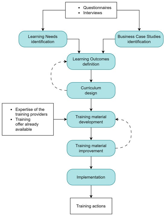 Furthermore, as a practical contribution to facilitate the replicability of this approach in other SME-oriented training contexts, this paper outlines the application of the proposed methodology. This process is based on insights gained from stakeholder and expert interviews and questionnaires, the definition of ad hoc business cases, the identification of different sets of learning outcomes, and the design and implementation of tailored, structured courses for both face-to-face and individual training activities.