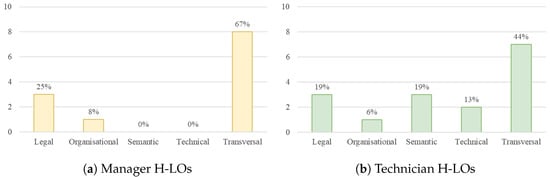 Horizontal LOs. A total of 12 H-LOs have been defined to meet the needs of SME managers, while 16 H-LOs were identified for SME technicians. Figure 5 provides a quantitative breakdown of their distribution across the four EIF interoperability layers. For both user profiles, the majority of LOs focus on transversal topics that span multiple interoperability layers, such as the Findable, Accessible, Interoperable, and Reusable (FAIR) data principles and concepts related to EIF. For managers, the second largest group of H-LOs (24%) concerns legal interoperability aspects. These cover EU data policies and initiatives pertinent to digital transformation and data interoperability (e.g., INSPIRE, the Open Data Directive, and the EU Data Strategy). In contrast, the technician profile includes several H-LOs focusing on the semantic (19%) and technical (13%) interoperability of location data. These outcomes cover topics like understanding ISO and DCAT metadata standards, describing UML representations of data models, and using OGC Web Services (such as OGC APIs). In addition, there is a single organizational H-LO that applies to both manager and technician profiles. It involves explaining which organizations are responsible for data interoperability at different levels (regional, national, European, global) and detailing their respective roles.