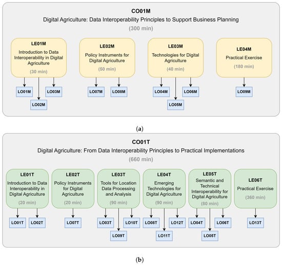 An iterative agile process led to the definition of general horizontal LOs (H-LOs) for location interoperability and sector-specific LOs for each BCS. These LOs were tailored to address the distinct needs of managers and technicians. The LO definition process relied on close collaboration among partners and stakeholders. Initially, LOs were identified for horizontal and BCS domains through a bottom-up method, followed by a top-down structuring of the curriculum. The verbs of Bloom’s Taxonomy were used to define each LO.