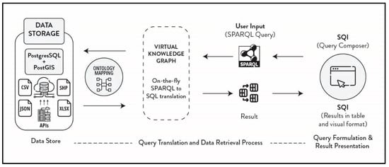 The framework can be divided into three components based on its functions. The first component is data storage, which is a database where all the related environmental data are stored for later use by queries. Then, there is a virtual component where KG is created on the fly based on user queries. Finally, there is a query composer with a result presentation interface, where the user can compose a query and obtain the results in table and visual format. This is also commonly known as the SPARQL endpoint. This framework uses a custom-built SPARQL Query Interface (SQI) over the virtual knowledge graph, which acts as an abstract layer that represents integrated data from various sources in the form of a graph. Users can formulate their queries on the interface without explicit knowledge of the underlying data structure.