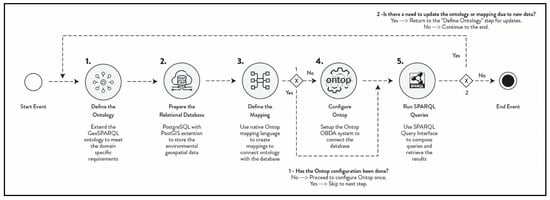 Step 2: Prepare the Relational Database: The relational database is created based on user requirements. For this purpose, it is essential to identify all relevant data sources and streams to be integrated by listing different data sources from databases, data warehouses, sensor networks, application program interfaces (APIs), and other GIS data sources. For this particular case, PostgreSQL with the PostGIS extension was used because of its wide recognition for its efficient storage and management of data, support for a wide range of data types, advanced querying functions, and seamless integration with the Ontop system. For database administration and development, pgAdmin 4 (