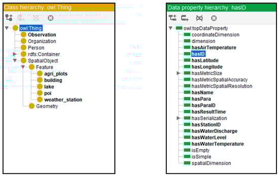 https://opengeospatial.github.io/ogc-geosparql/geosparql11/ (accessed on 1 July 2024)) was selected as the foundation and extended with custom elements to match the requirements of this framework and experimental queries. The extended ontology was designed to integrate and manage geospatial and observational data for this project. It defines data properties for capturing specific measurements (e.g., temperature, water level, etc.), spatial coordinates, and identifiers. It includes classes for different features such as lakes, buildings, agricultural plots, weather stations, and points of interest. Given that the use cases primarily focus on environmental geospatial data, GeoSPARQL is an ideal choice due to its minimalistic nature as it covers the fundamental aspects of geospatial data such as data types and data properties to cover different geospatial data types and their characteristics and object properties to cover relationships between objects. This approach ensures that the ontology supports both spatial and non-spatial data, making it easier to integrate, query, and analyze geospatial information from multiple sources in the context of environmental management.