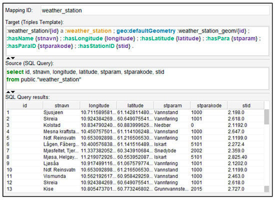 source: Defines the SQL query to extract the relevant data from the relational database. This specifies which tables the data come from (weather_station), which columns are used (id, stnavn, longitude, latitude, etc.), and any joints or filters required to prepare the data for mapping. As a result, the query extracts seven columns (id, stnavn, longitude, latitude, stparam, stparakode, and stid) from weather_station table in the predefined database, ensuring that the required attributes are available for subsequent semantic mapping and integration into the ontology.