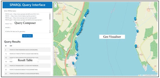 Step 5: SPARQL Query Interface (SQI). After configuring the Ontop system, the user can compose SPARQL queries and run them against the relational database through the virtual RDF graph to retrieve the data. For this purpose, a user-friendly query composer and data retrieval and presenting interface are very important for retrieving and analyzing the stored data. An easy-to-use user interface is necessary to motivate users to use the application daily in different decision-making scenarios. Therefore, a simple user interface was developed to compose SPARQL queries and show results in a table and visual format (on a map) based on the input query. This web application is based on an Ontop inbuilt local SPARQL endpoint. This connects ontologies to relational databases, enabling the translation of SPARQL queries into SQL queries that can be executed on the underlying database.