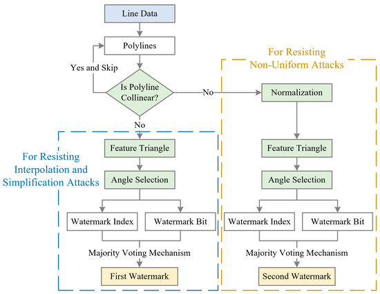 Current watermarking algorithms for vector geographic data can be broadly classified into embedded watermarking and constructive watermarking [7]. Embedded watermarking modifies the coordinates (including features derived from coordinates), the attribute, or the storage order to embed watermark information directly into the vector geographic data. For example, Peng et al. [8] used the Douglas–Peucker compression algorithm [9] to construct the feature vertex distance ratio (FVDR), embedding the watermark by adjusting the FVDR. Other approaches include embedding invisible characters into the attribute values of road data [10] or changing the storage order of vertices within polylines to embed the watermark information [11]. While embedded watermarking increases the relationship between the data and the watermark, it inevitably alters the data. Methods that embed watermarks into coordinates affect data precision, making them unsuitable for high data accuracy scenarios. Methods embedding watermarks into attributes increase file size and storage demands, potentially exposing the watermark to attackers. Furthermore, embedding watermarks into storage order may disrupt the semantic or functional meaning of the data, such as river flow directions or pipeline pathways. Therefore, the robustness of embedded watermarking is achieved at the cost of data integrity, limiting its application.