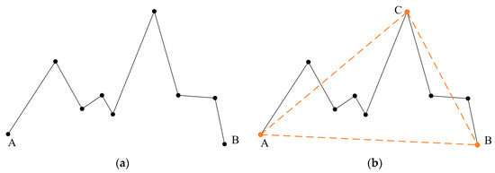As illustrated in Figure 2, a polyline consisting of nine vertices is shown in Figure 2a, where A and B represent the first and last points, respectively. The vertex C, identified as the farthest point from AB, completes the feature triangle, as depicted in Figure 2b. This construction method corresponds to the initial step of the Douglas–Peucker compression algorithm. However, unlike the Douglas–Peucker algorithm, which recursively divides the polyline to find additional feature points, the proposed method selects only the farthest point. This is not a simplification of the process but a deliberate choice to improve robustness against compression attacks. As noted in the literature [13], when fewer feature points are retained, the watermarking scheme exhibits greater resistance to compression, as excessive simplification would be required to disrupt the constructed triangle.
