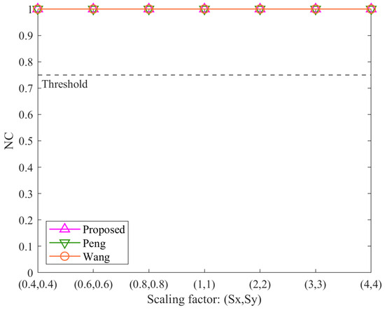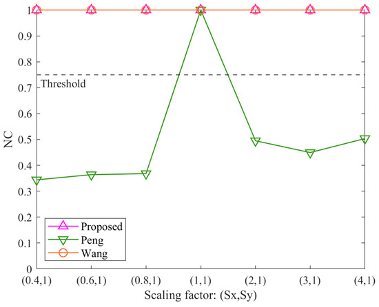 In contrast, the results for non-uniform scaling attacks in Figure 7 highlight distinct differences. The proposed algorithm and the method Wang maintain NC values of 1.00 across all tested scaling factors (Sx ≠ Sy), demonstrating their stability. The method Peng, however, shows a significant decline, with NC values falling below the threshold except when Sx = Sy = 1 (no scaling). This indicates that the method Peng is unable to resist non-uniform scaling attacks. The superior performance of the proposed method confirms the effectiveness of its normalization step, which eliminates distortions caused by non-uniform scaling. The method Wang also performs well under non-uniform scaling due to its reliance on vertex count and storage order features, which remain stable during such transformations.