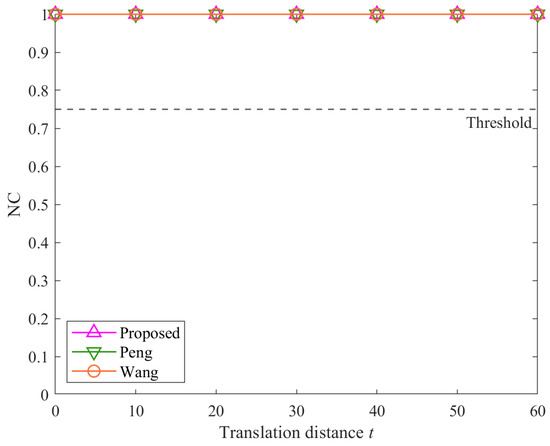 From Figure 5, Figure 6, and Figure 8, it is evident that regardless of attack intensity, all three algorithms achieve NC values of 1.00, significantly above the threshold of 0.75. This indicates that the proposed algorithm, like the method Peng and the method Wang, is robust against rotation, uniform scaling, and translation attacks. These results affirm that the angular features used in the proposed method are invariant to these geometric transformations.