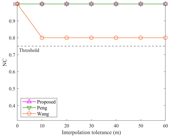 As shown in Figure 9, under interpolation attacks, the proposed algorithm and the method Peng consistently achieve NC values of 1.00 across all interpolation tolerances. In contrast, the NC values of the method Wang decrease immediately after the interpolation tolerance increases from 0 and stabilize around 0.8. This disparity is due to the feature extraction mechanisms of each algorithm. The method Peng leverages the Douglas–Peucker algorithm to construct FVDR features, effectively ignoring additional vertices introduced by interpolation. Similarly, the proposed algorithm relies on feature triangle construction, which also employs the Douglas–Peucker algorithm, rendering it immune to the effects of interpolation. However, the method Wang, which constructs its watermark based on vertex count, is directly influenced by the increased number of vertices, leading to reduced robustness. Despite this, the NC values of the method Wang remain above the threshold due to its use of relative values across all polyline combinations.