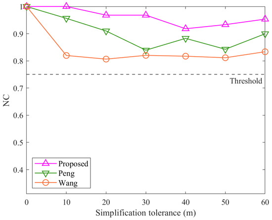 In simplification attacks, as shown in Figure 10, the overall trend is that the proposed algorithm outperforms the method Peng, which in turn outperforms the method Wang. As the simplification tolerance increases, the number of vertices in the polylines decreases, causing a gradual decline in NC values across all algorithms. The superior performance of the proposed algorithm can be explained by its reliance on only three critical points within each polyline: the start point, the endpoint, and the farthest point from the line segment connecting them. This design ensures that the watermark remains intact unless a polyline is reduced to just two points. In comparison, the method Peng, which uses a relative threshold of 0.3 in its FVDR construction, performs well but cannot match the proposed algorithm’s resilience. Notably, if the method Peng had used a properly selected threshold, it would have achieved comparable robustness to the proposed algorithm under simplification attacks. However, the original publication of the method Peng does not specify such a value explicitly, and 0.3 was chosen for this experiment as a reasonable compromise to reflect typical scenarios. The method Wang, as with interpolation attacks, is heavily impacted by changes in vertex count, resulting in the lowest robustness among the three algorithms.