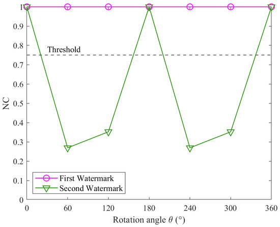 The proposed algorithm is configured with key parameters to balance robustness and computational efficiency. The angle quantization precision q is set to 4, meaning the quantization process retains all digits from the start of the number up to and including the fourth digit after the decimal point. The watermark length N is chosen as 64, providing a suitable trade-off between performance and computational cost. An NC threshold of 0.75 is adopted, referencing values commonly used in prior literature [7,21,29,30]. These settings are empirically determined to provide reliable performance under various attack scenarios.